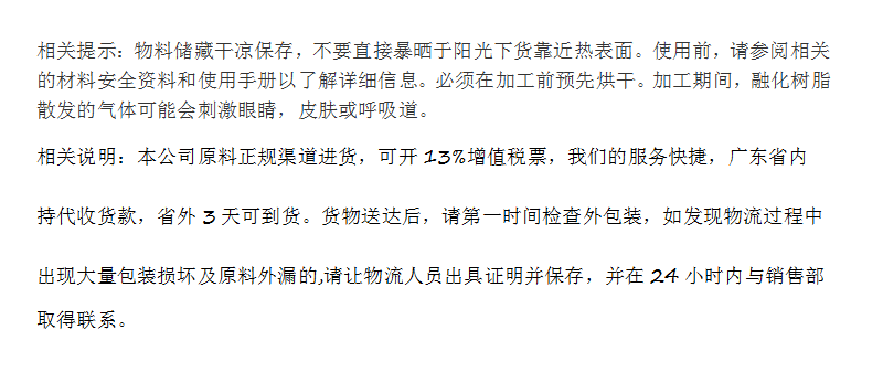 4、耐疲勞性佳;5、耐候性佳;6、電氣特性優(yōu);7、無(wú)味無(wú)臭對(duì)人體無(wú)害符合衛(wèi)生安全;8、成形收縮率低、尺寸安定性良好。